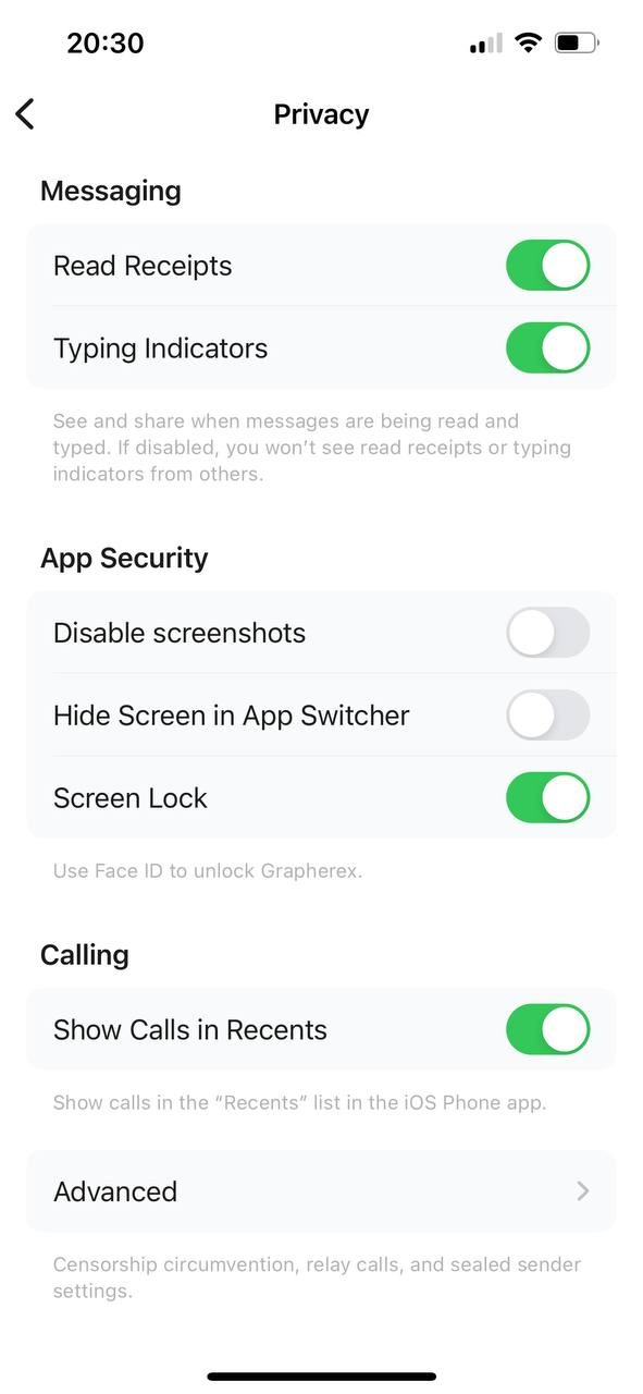 Grapherex allows you to enable a screen security feature that prevents screenshots in your chats.